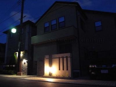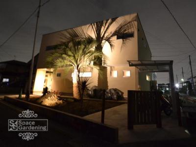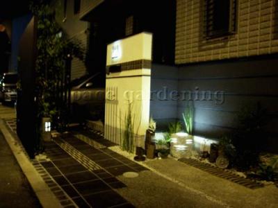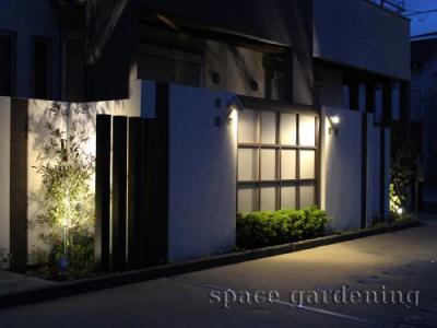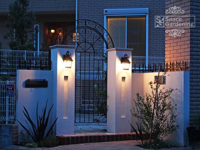 ライティングされた門まわりは昼間とは違った景色を見せて
