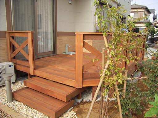 ウリン材(長期間メンテナンス不要のアイアンウッド)でつくった『ウッドデッキ』 クロス型のフェンスは製作に苦労しました。床下には、雑草防止に防草シート&砂利敷きを施しています。