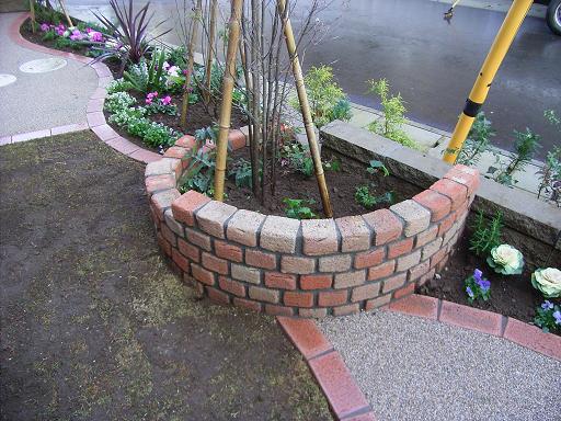 土のままであったお庭をリフレッシュ。既に植えてあった樹木はそのままにレンガで見切りをつけてみました。半分に切って積んだレンガ花壇はとてもかわいい出来ばえでお庭のアクセントとなっています。