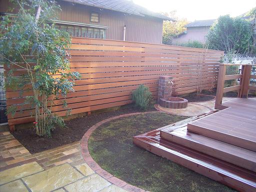 お隣様との境界にウリン材を活用した『ボーダーフェンス』を設け、お庭でのプライベートな時間を気兼ねなく過ごしていただけるようにしました。デッキでのティータイムも楽しめそうです。左の常緑樹は、『シマトネリコ』、今、女性に大人気の樹木です。葉っぱがかわいいと評判です。