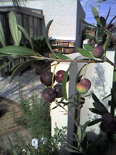 オリーフ゛に実が付きました。この写真は少し前に撮影したもので今はアメリカンチェリーのような色をしています。そこであまりにもおいしいそうなのできんきんが味見をしたとろ、苦みと辛味が同時にきたらしく