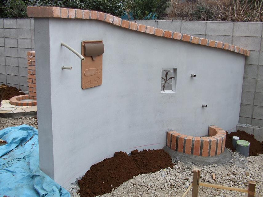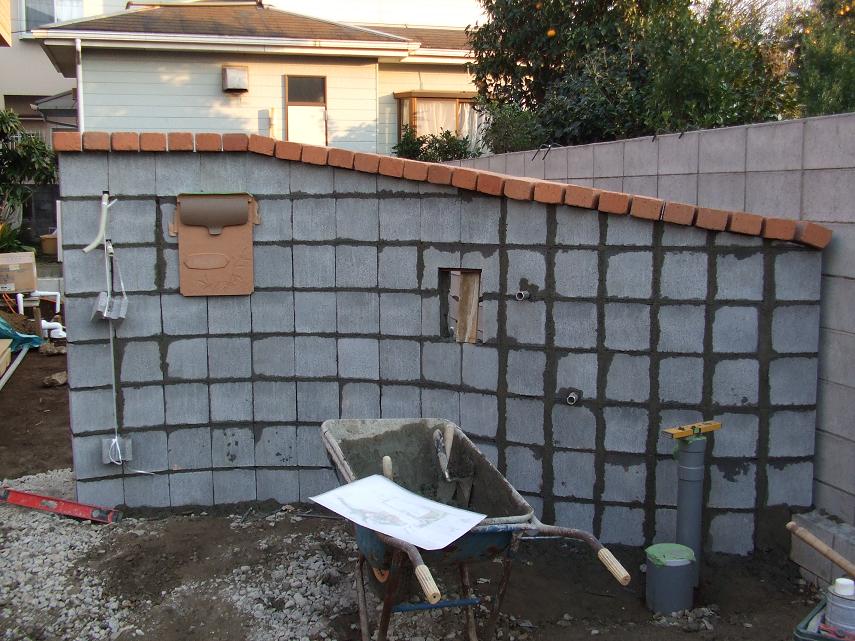 積上げたブロックの表面に左官をかけ終ったところです。専門店でしか取り扱いのないディーズガーデンのポストも組み込まれ、照明やインターホンの配線も完成をイメージして位置を決定しています。今回の門壁、表札などはもちろん取り付けるのですが、もうひとつ、立水栓の役目を持たせています。壁の右側に見えるのが、“給水管の取り出し口”今回は手洗い用とホース専用と2箇所設けました、下に見えるレンガが“受け”となります。