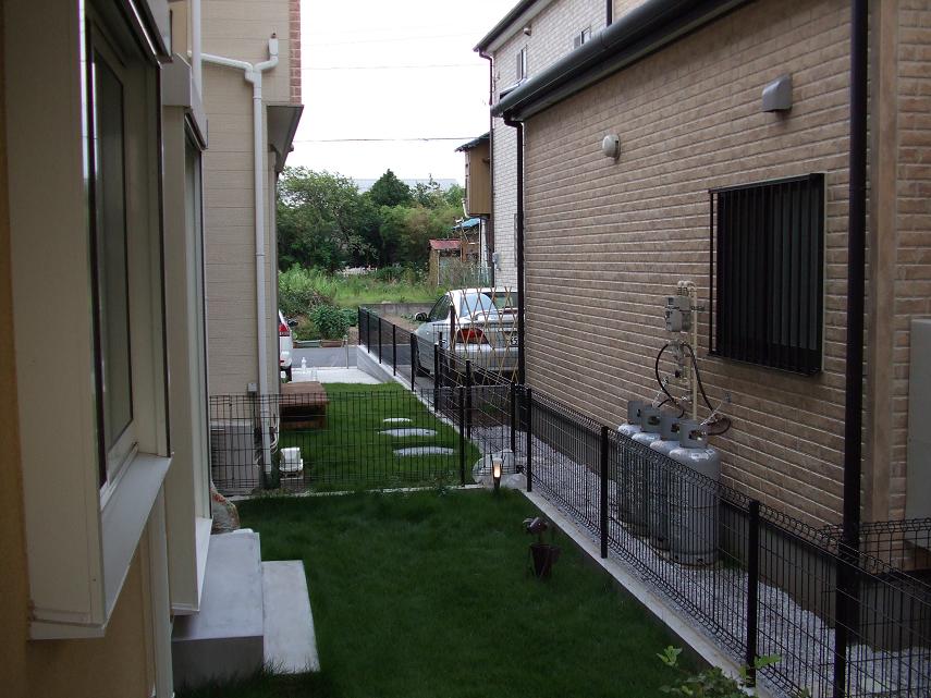施工前・・・ご自宅の掃きだし窓正面に位置する、お向かい様の窓が気になります。また、ガスボンベも隠したいですね。お隣さまとも、ワンクッション置きたい。そんな状態でした。