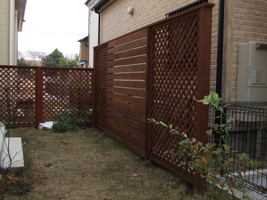 横に板を貼るボーダータイプと、網目のラチスタイプを組合せ、窓部分は目隠し性を高く、他の部分は、見通しよくと考えています。隣地部分は、高さを低くして、圧迫感が内容に工夫しています。