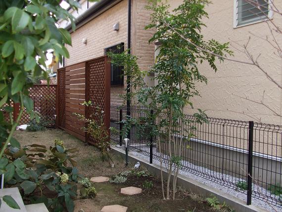 お庭に出て楽しめる空間になったのではないでしょうか。境界沿い一面を目隠しするのではなく、気になるところはどこなのかを、考えていくと、圧迫感とは無縁のものが出来上がります。植栽との組合せも良いと思います。
