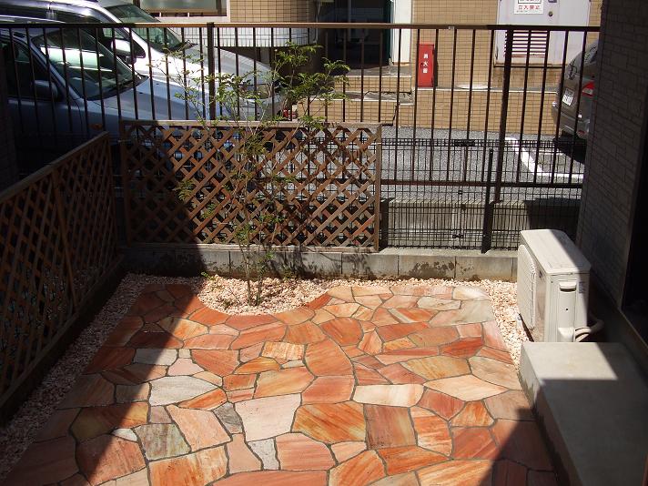 施工後:境界側にはシンボルツリーを配置、まだまだ、小さく華奢に見えますが、これから大きくなり、自然の目隠しへ成長していきます。植えさせていただいたのは“シマトネリコ”涼しげな姿が、好評な木です。手前の自然石乱貼りは、石職人が石を一枚、一枚、手作業で割り砕き、仕上げたものです。割り砕く作業をすることで、目地を均一化し、とても高級感ある美しい仕上がりとなります。