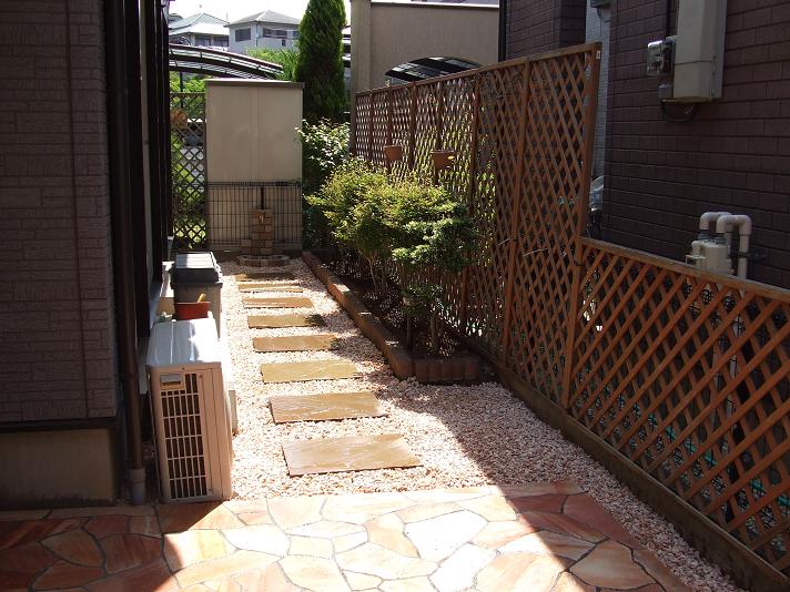 施工後:矩形の自然石を飛石に、まわりは化粧砂利。砂利の下には、防草シートを敷きこんでいます。雑草の抑制に繋がるのはもちろん、砂利が土に沈み込んでしまうのも防いでくれます。正面に新設した立水栓。ユニットタイプですが、レンガスタイルのおしゃれなユニットです。蛇口もとりさんの形をしています。