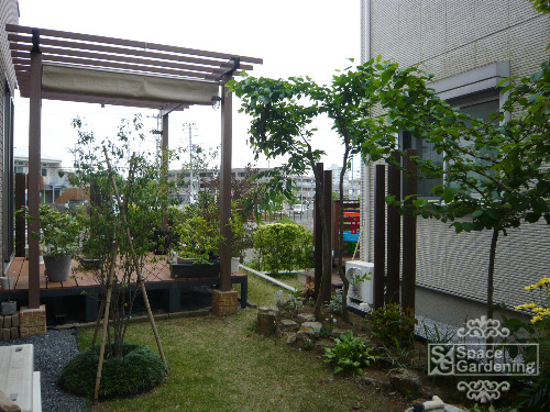 開閉シェードのレール接続部へ注油させて頂きました。植木(ポップブッシュ)の支柱補強させて頂きました。