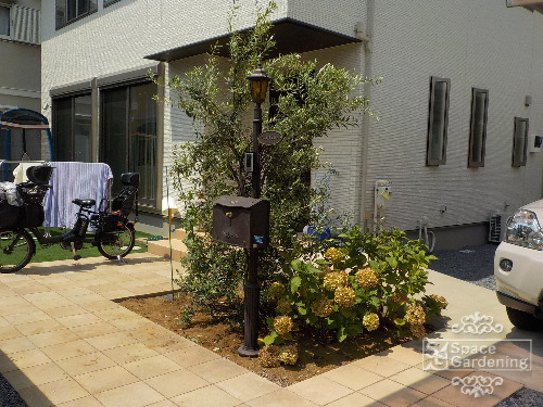 植木(オリーブ)の支柱が植木の成長に伴い外れておりましたので、支柱立て直しさせて頂きました。
