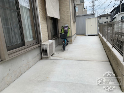 土間コンクリートの欠けた個所、埋め補修させて頂きました。植木(ホンコンエンシス)シュロ縄にて強風対策させて頂きました。立水栓パンの塗装剥がれは後日補修させて頂きます。