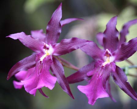 中南米が原産の着生ランです。ランといっても高地が原産の花なので、暑さは苦手です。赤・黄・紫の色の個性の強い花です。