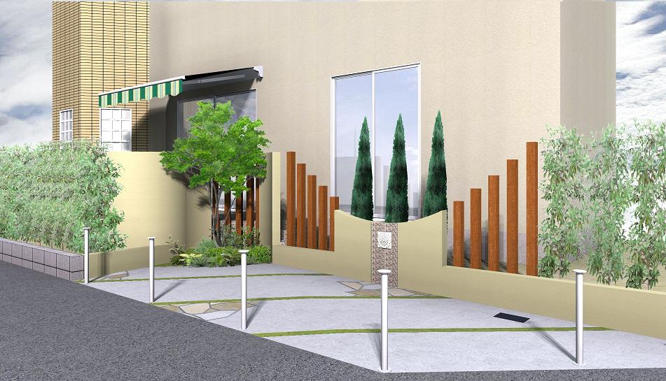 本日ご来店くださいましたT様のリニューアルエクステリア&ガーデンです。壁の裏側には、テラスと立水栓を設け、家族で楽しいガーデンライフを送れるようにデザインされています。次回は、T様のご要望をふまえて、さらに素敵なプランをお届けします♪