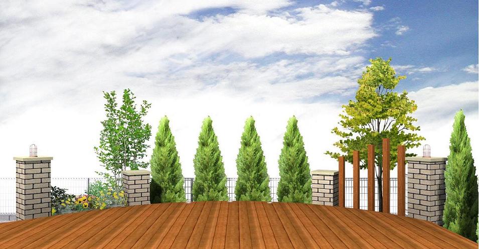 木と緑の中に、ポイントでレンガを使うことで、ナチュラルなイメージに。