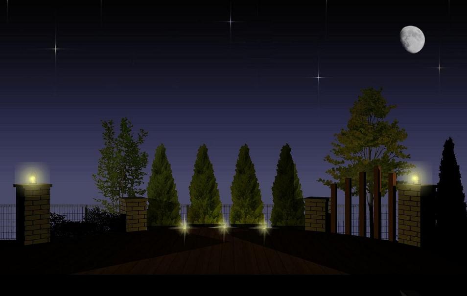 デッキに埋め込んだライトとレンガの角柱の上につけたライトで、夜も楽しめるウッドデッキスペースです。