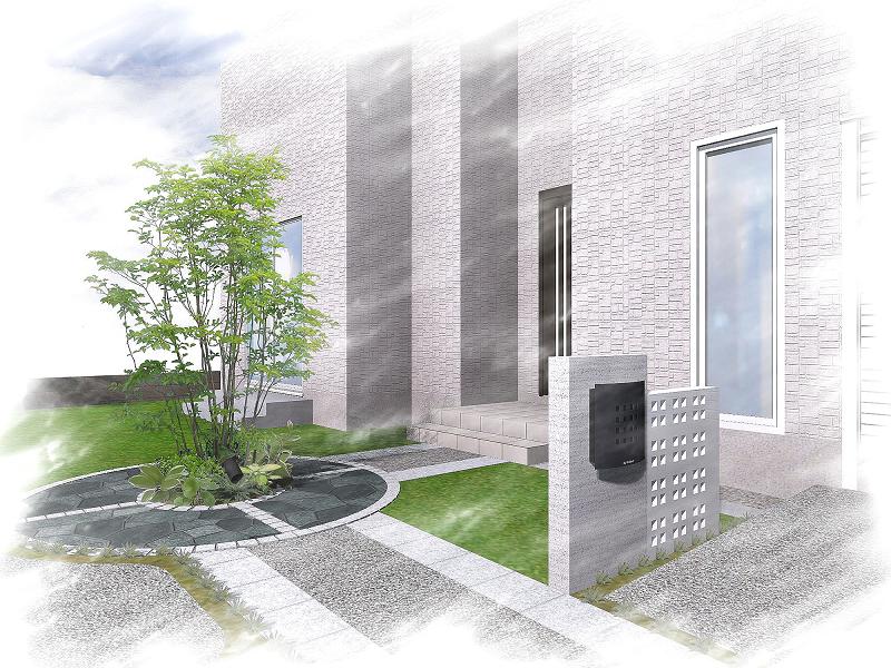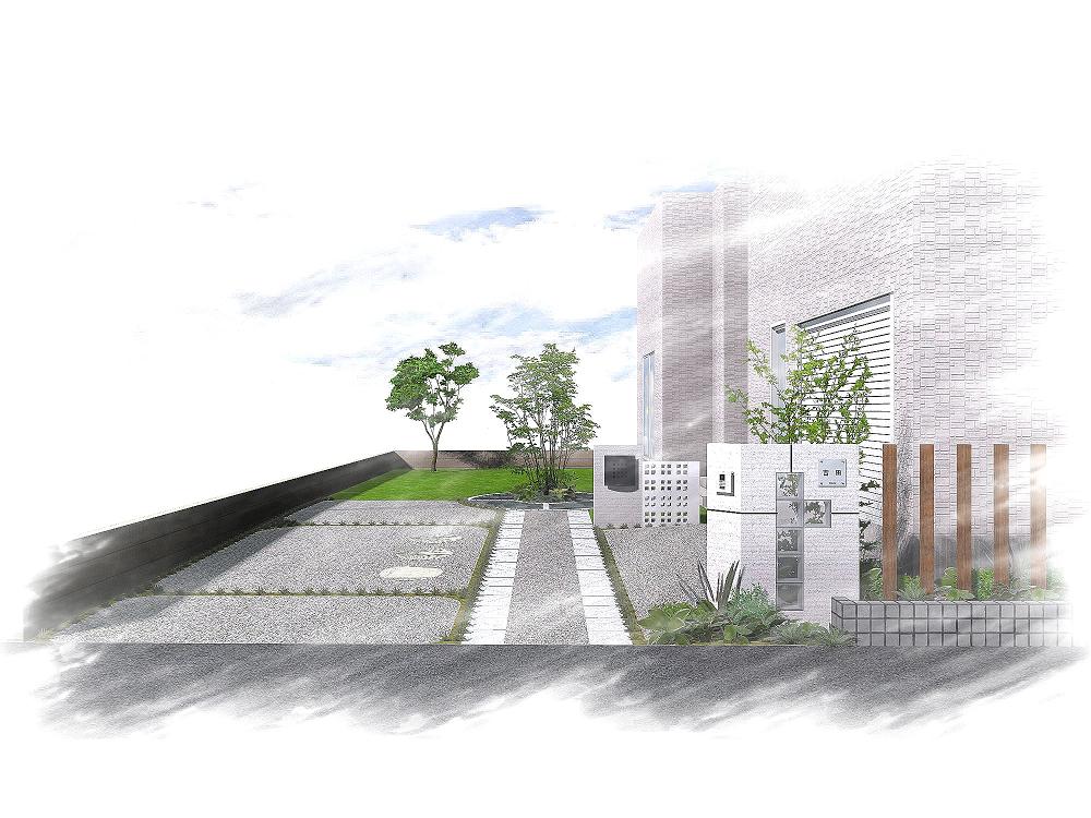 ただ今、工事部隊のまもる班が担当しています、船橋市のY様邸のパースです。モノトーン+スクエアで統一し、建物に合うようシックなデザインとなっています。アプローチの先で玄関前にあたる空間には、自然石の乱貼りでサークルを設け、ポイント&リズム感を生み出しています。高橋店長デザイン。工事の様子は、工事部隊ブログをご覧ください。
