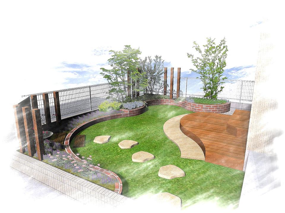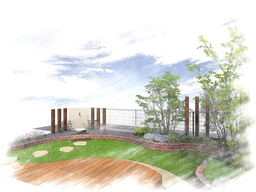 現在施工中の鎌ヶ谷市・H様邸のパース。滑らかな曲線を描くウッドデッキに、草花溢れるレンガ花壇、曲線のやわらかさの中に引き立つウリンの角柱と飾り壁。ナチュラルな雰囲気を演出したお庭です。高橋デザイン。