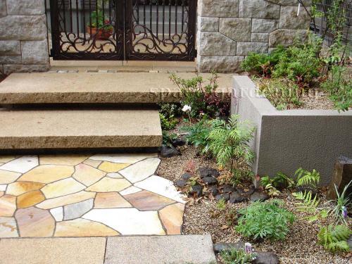 ハイクラス和モダン新築外構アプローチ石貼りパラストーン乱形門柱門扉