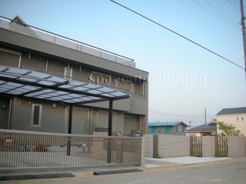 シンプル新築外構クローズ門柱門扉塀駐車場車庫扉カーポート塀