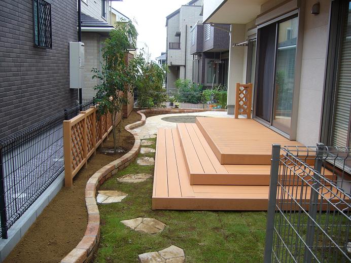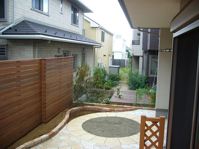 ウリン材で目隠しフェンス、レンガを曲線で積み花壇をつくり高さをだして、