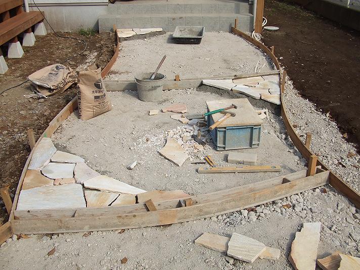 石貼りは、専門の石職人さんが、石のよさが出るように一枚、一枚、石を割ったり、削ったりして敷きこんでいきます。こうした作業が、目地の綺麗な仕上がりとなっていくのです。
