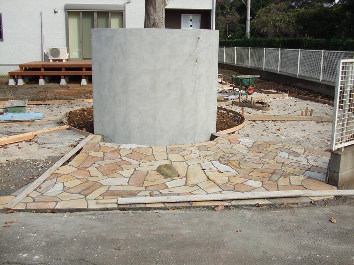 N様、石貼り工事が本日完了です。砕石だけの駐車場、玄関アプローチが華やかになってきました。パールイエローの天然石がとても綺麗です。