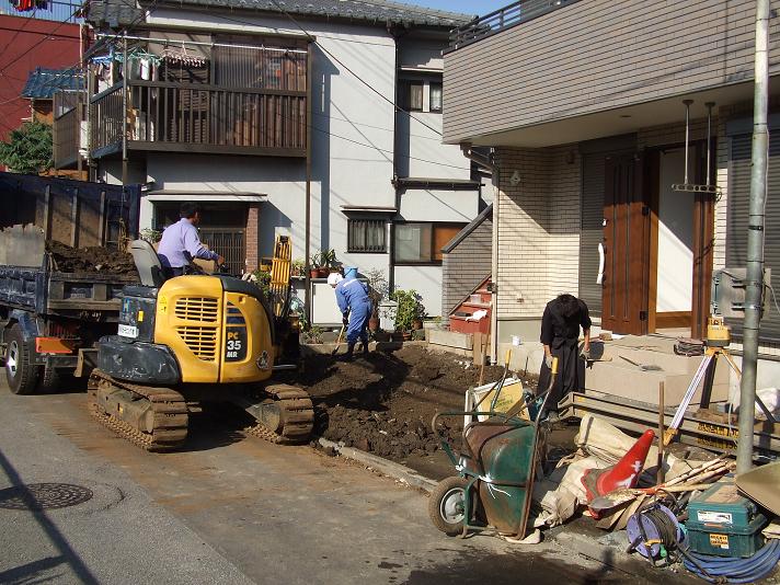 週初めはまだ建物の工事中でしたが、職人さん同士の連携ですばやく着工できました。土の掘削作業は埋設管などを傷つけないよう細心の注意が必要です。