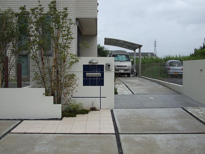 先週の社内施工コンクールにおいて、“銀賞”を受賞した作品をご紹介いたします。建物のスタイルに合わせ、モダン&クールに、玄関ドアの色、ブルーとあわせて門壁にもブルーのタイルをアクセントの用いてみました。ガラス表札、インターホンカバーなど小物も凝っていますが、下地に溝をつけたりと、モザイクタイルを貼ったりと、職人の技も光る、最高の出来です。