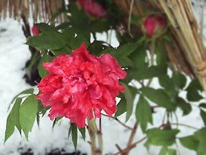 あります。雪の白とボタンの花の対比が