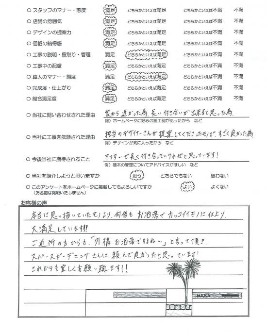本当に思い描いていたモノより、何倍もお洒落でカッコイイモノに仕上り、 大満足しています!! ご近所の方からも、「外構お洒落ですよね〜」と言って頂き、 スペースガーデニングさんに頼んで良かったと思っています! これからも宜しくお願い致します!!