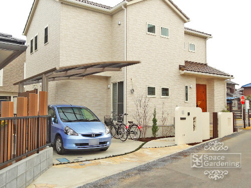 シンプル新築外構セミクローズカーポート駐車場門柱塗り壁 -