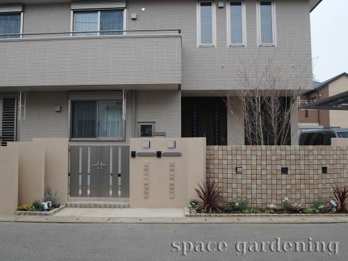 シンプル新築外構門柱塗り壁塀タイル門扉花壇